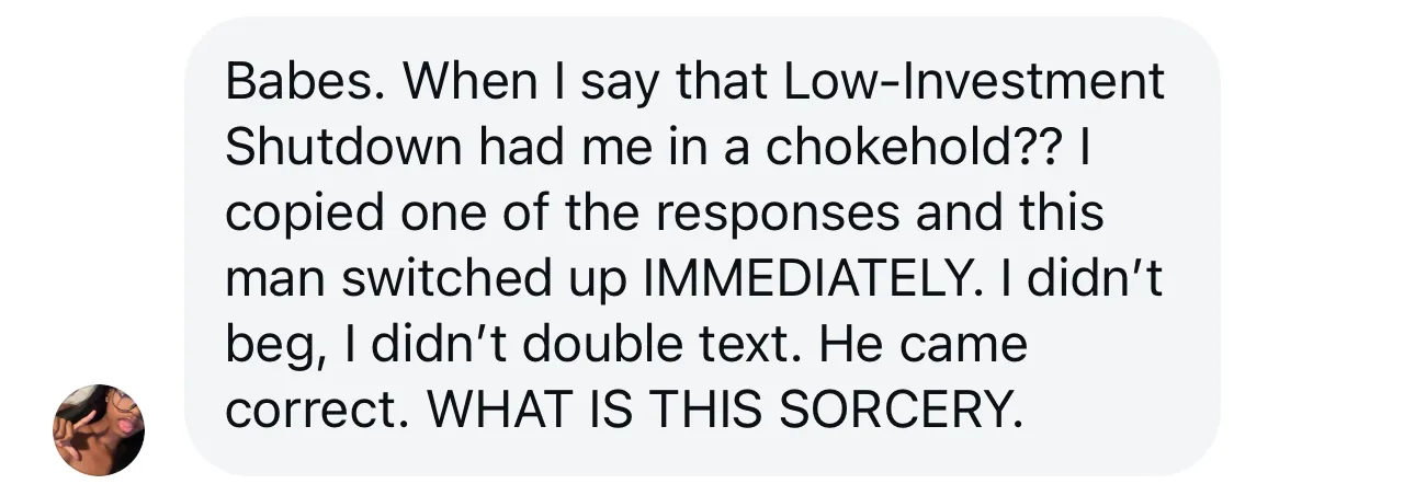 - The “Low-Investment Shutdown” : how to make a man step up without saying much at all.